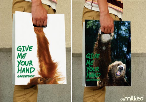 This is a really clever and eye-catching design once again by greenpeace. They come up with shocking advertisements to make sure they are not going un-noticed. I really like this idea where it looks like the animals are hanging off your hand when you walk holding the bag.